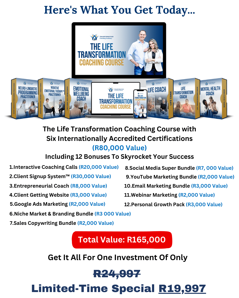 Take advantage of our Limited Time Special once-off payment offer and transform your life with the complete Life Transformation Life Coaching Certification Course. This package includes all 19 bonuses, valued at R143,500. You can get it all for just R19,997, saving you R5,000 off the full price of R24,997. Don't miss out on this opportunity to invest in your future! Remember, you have a 7-day no-questions-asked Money-Back Guarantee, so there is no risk to you.